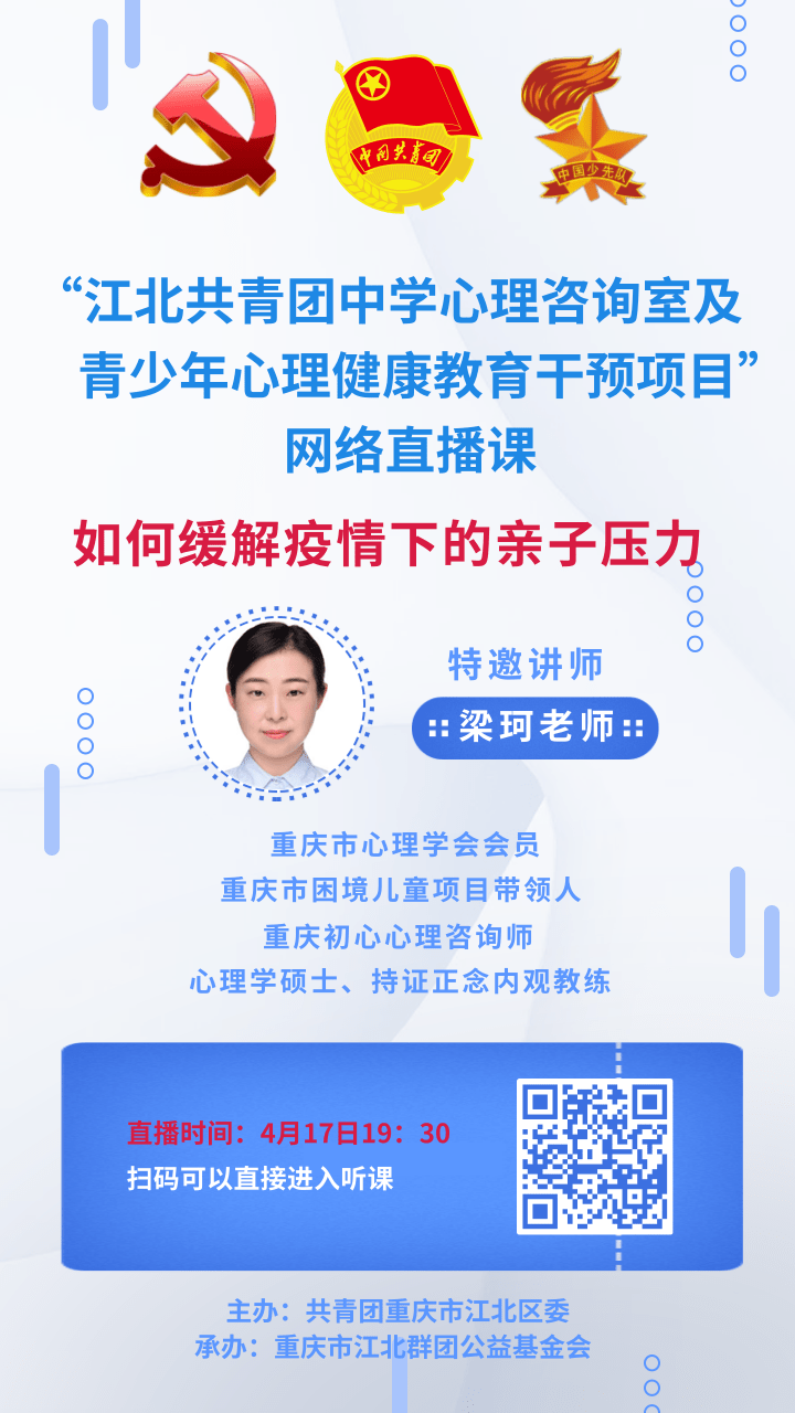 4月17日,依托江北团区委已设立的心理咨询室,我重庆初心心理工作室在现有基础开设了心理干预直播课程,为即将开学的中小学生安抚疫情心理压力,引导青少年以积极阳光的心态面对学习和生活,同时也引导家长们做顺畅的亲子沟通,促进良好的亲子关系。