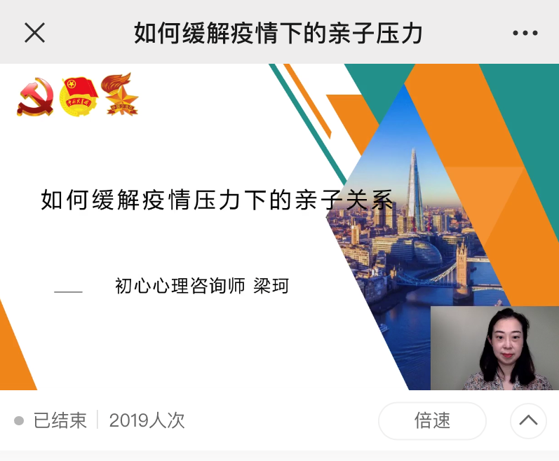 在直播课程中,我重庆初心心理工作室的梁珂老师为大家讲解了疫情压力下的家庭亲子压力、家长自我情绪的认识与管理、如何进行良好的亲子关系与亲子沟通三个部分的内容,得到了广大家长学生的好评。