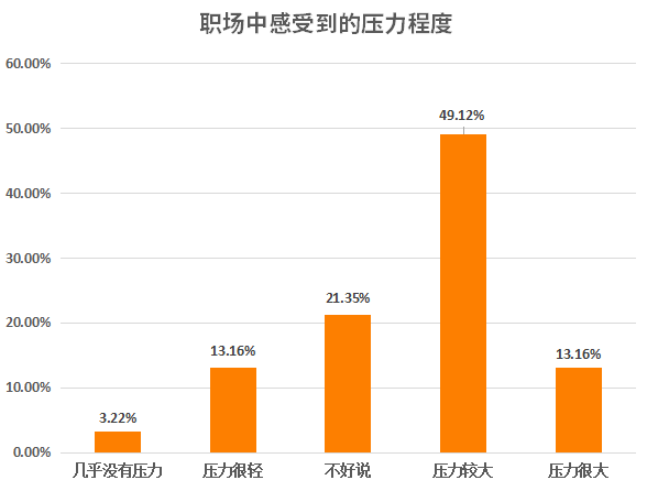 据调查结果显示:全国职场人的职场满意度,自我评分均值仅为6.6分,刚刚过及格线,62.28%的人觉得压力过大,压力过大成为职场状况不满意的主要原因。68.7%的人觉得自己的职场压力已经影响了生活。