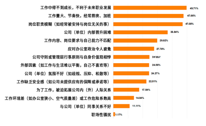 在调查中发现,“工作中得不到成长”、“工作量大、节奏快”和“岗位权责模糊”是勾选*多的三项,“公司内部晋升困难”和“工作岗位与自身能力不匹配”也是主要的压力来源。由此可以看出,大家的职场压力,大多来自那些阻碍自身发展的压力源。